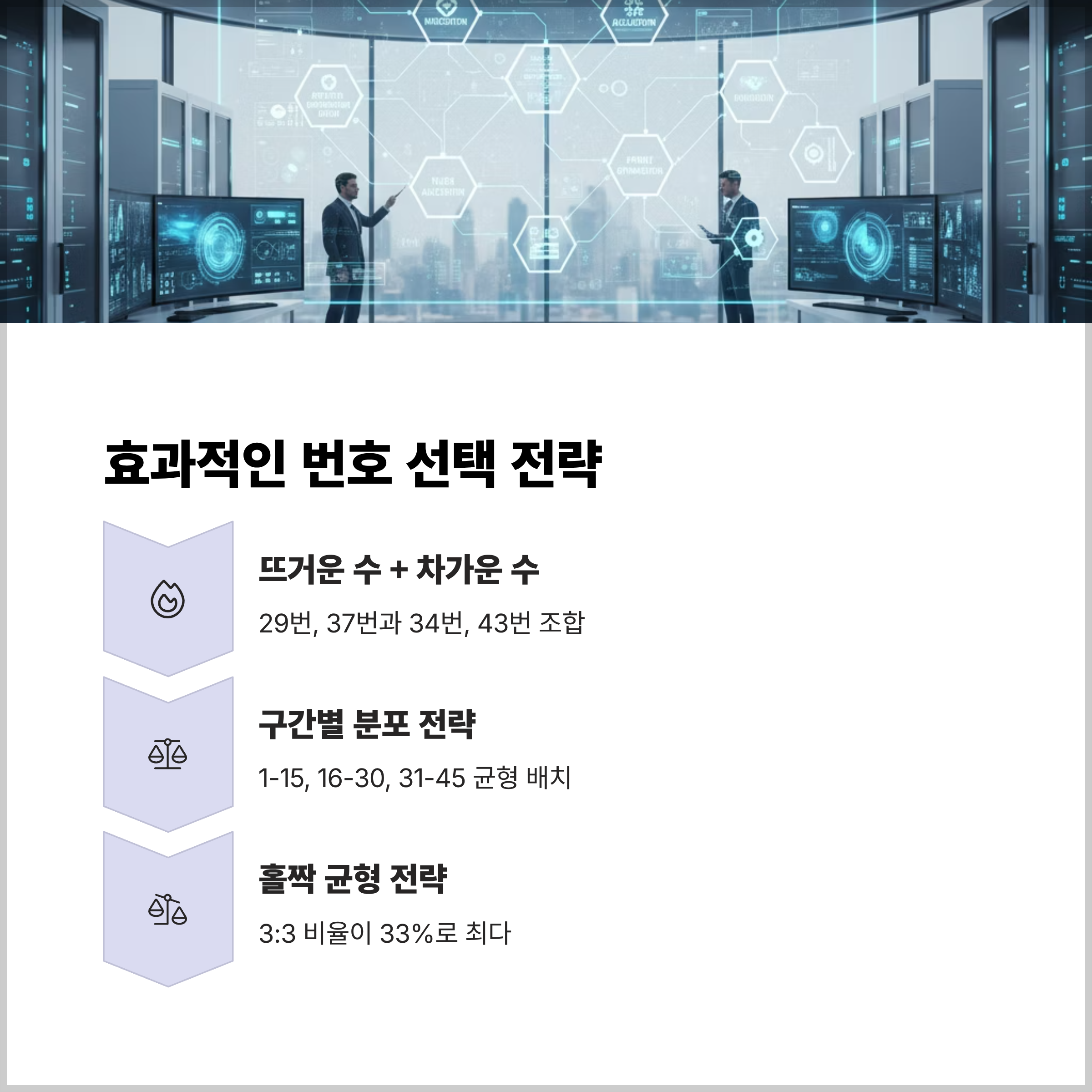 첫 번째 전략은 뜨거운 수와 차가운 수의 조합입니다. 현재 가장 뜨거운 29번, 37번과 함께 장기 미출현인 34번, 43번을 조합하는 방식입니다. 통계적으로 뜨거운 수 2 ~ 3개와 차가운 수 1 ~ 2개를 포함하는 조합이 전체 당첨의 65%를 차지합니다.