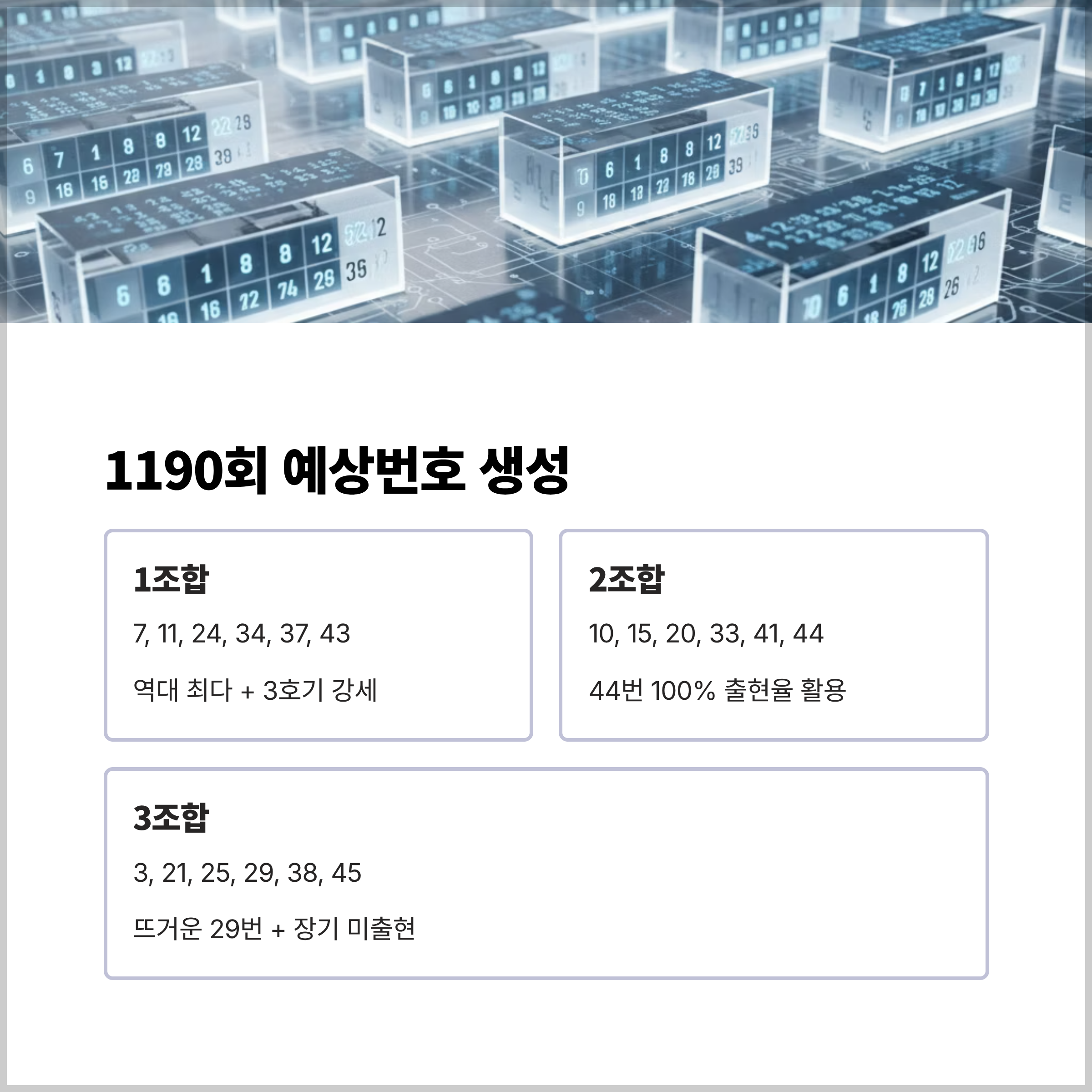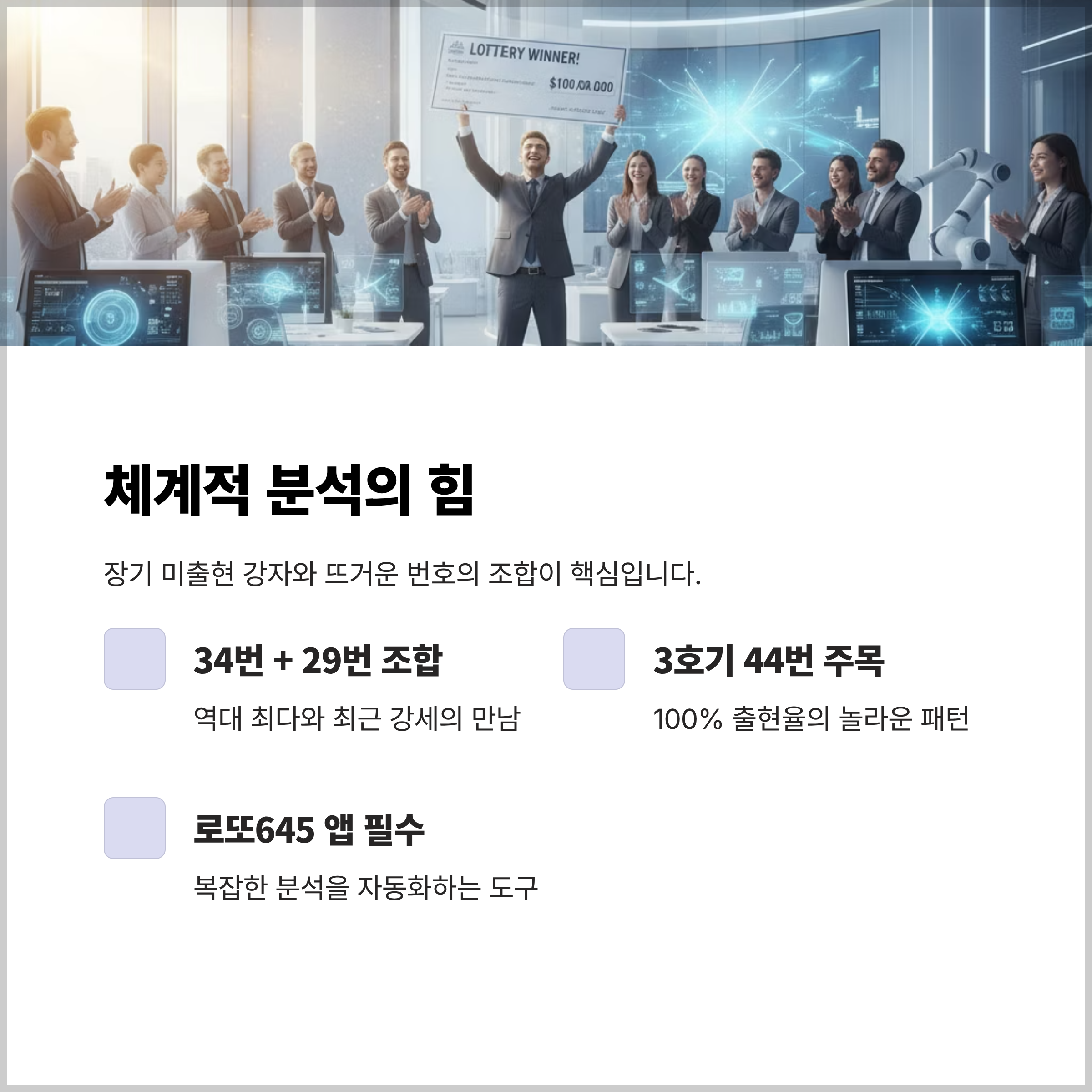 특히 34번처럼 역대 최다 출현이면서 장기 침묵 중인 번호와 29번처럼 최근 강세를 보이는 번호를 함께 고려하는 것이 효과적입니다. 3호기 패턴을 분석하면 44번의 100% 출현율도 무시할 수 없는 지표입니다.