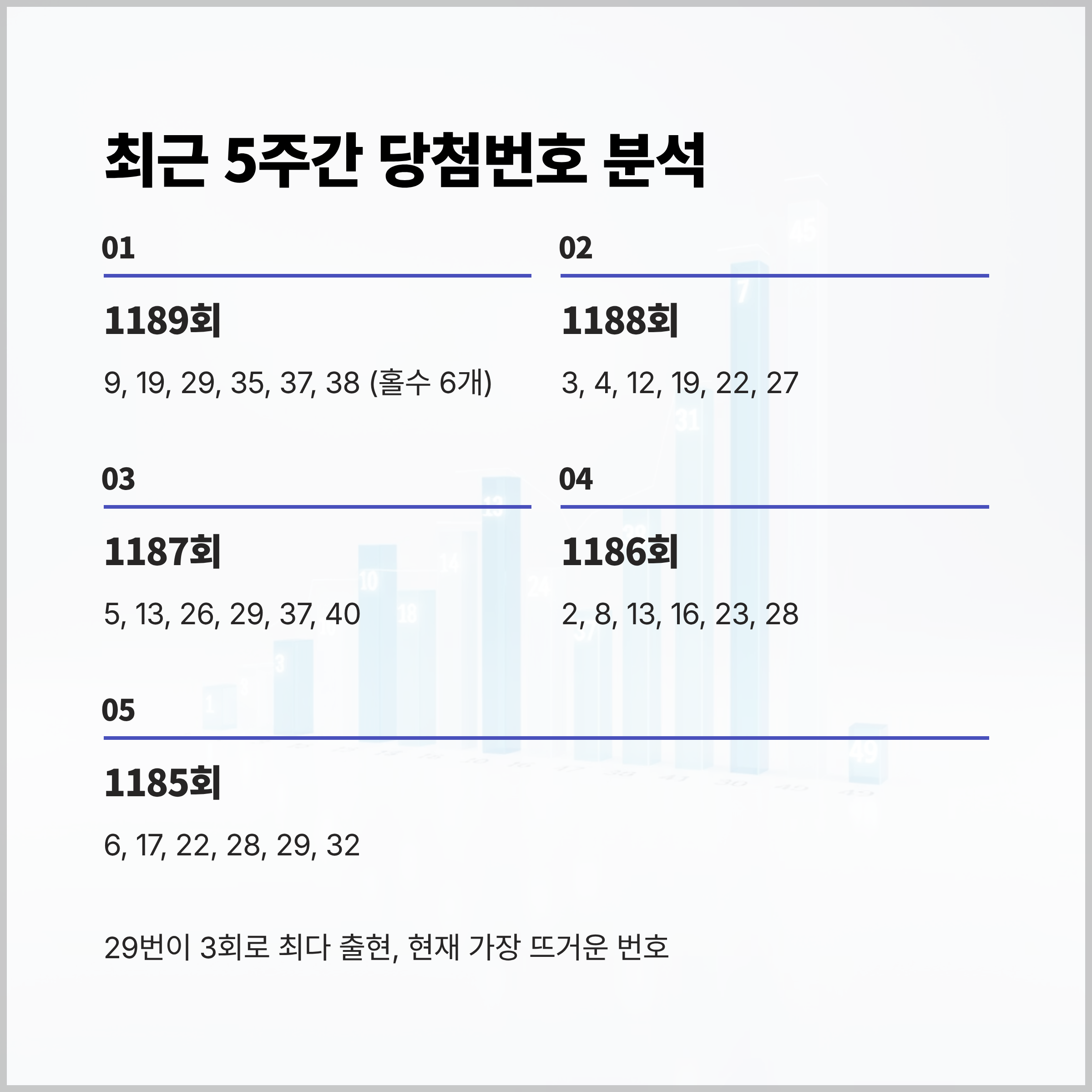 이 기간 동안 29번이 3회로 최다 출현했고, 37번, 13번, 22번, 28번, 19번이 각각 2회씩 나왔습니다. 특히 29번은 1189회, 1187회, 1185회에 고르게 분포되어 있어 현재 가장 주목받는 번호입니다.